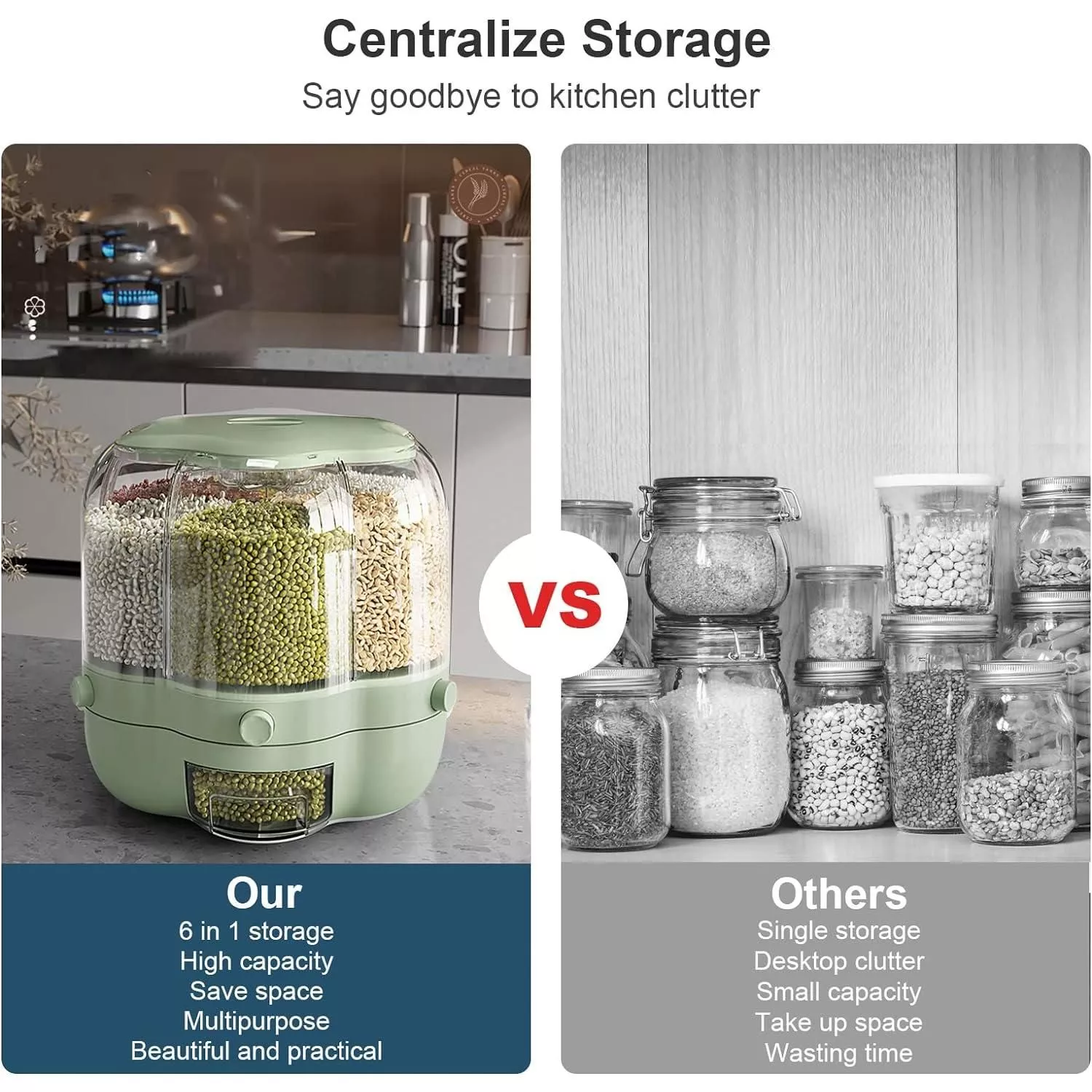 Our dispenser stands out due to its combination of functional design and aesthetic appeal. The six separate compartments allow for varied storage, while the rotating base makes it easy to access each one. The sealed design ensures that your food stays fresh longer, reducing waste and maintaining quality. Its modern appearance enhances your kitchen’s look, making it not just a storage solution, but a decorative feature as well.